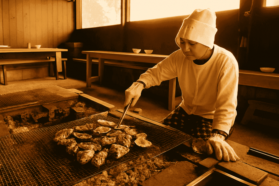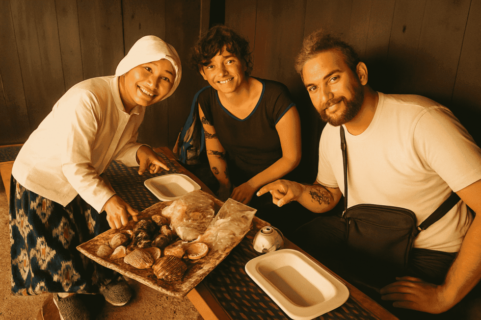 • Almorzarás en una cabaña tradicional Ama mientras ellas cocinan sobre las brasas marisco fresco frente a ti.